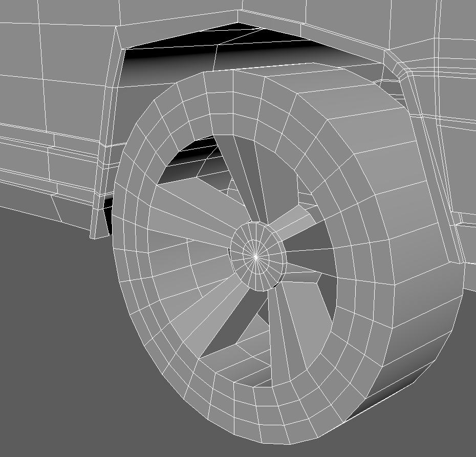To model the wheels of the car I made use of a technique I learned from the 'Automotive modeling in Maya' tutorial. In this method, we use a cylinder and a pipe to model a wheel. The pipe would act as the outside tire that normally houses treads, grooves, etc. Meanwhile, the cylinder serves as the rim on the inner side from which spokes originate to the inner edge of the tire which is where the other would be. While doing this, we need to align both the pipe and the cylinder to be concentric with the pipe on the outside and the cylinder, inside. Thus the pipe would be larger than the cylinder. We must ensure that the number of subdivisions on the axes match between the pipe and the cylinder. The idea behind this is that the space between the axes in the smaller polygon (the cylinder in our case) would be lesser than the larger polygon (the pipe) even when we have the same number of sub-divisions. Thus the number of subdivisions on the pipe must be larger to avoid any rotational requirements. Following this, Simply combining faces will give the desired spokes. To connect the spokes, we can 'bridge' faces together in Edit Mesh menu. I added edge loops to tighten the spokes. I moved them to accurate position along the wheel well after this.