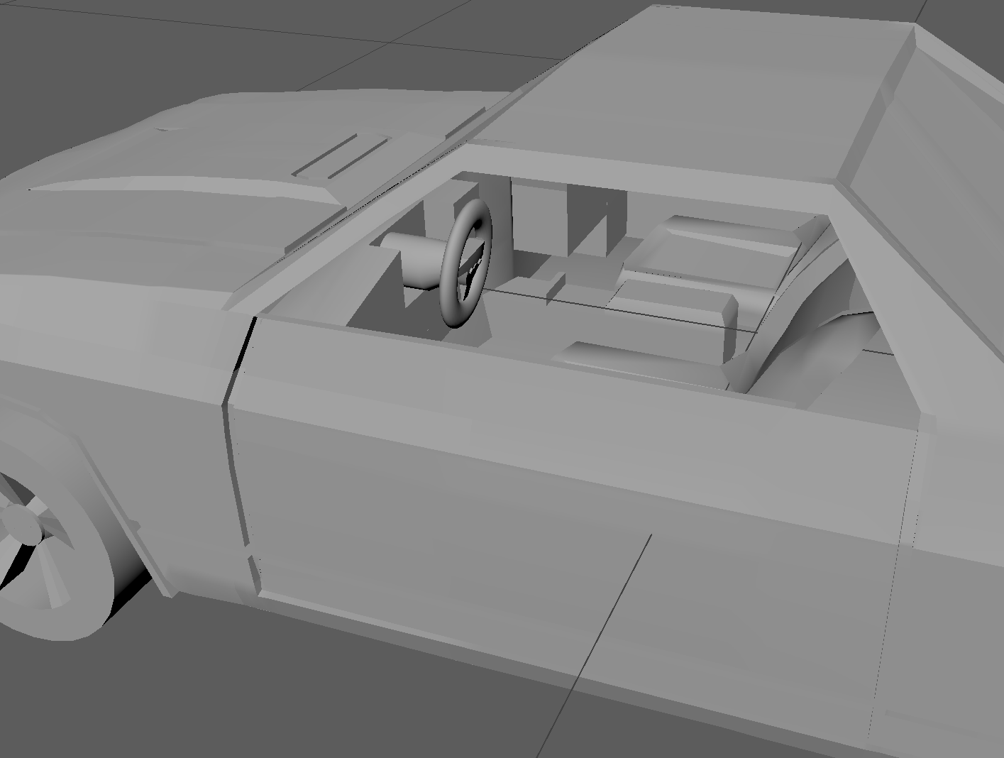 I used a narrow but deep cube to model the interior of the car which mainly deals with the dash board and the side rims and the console box. The dash board is a somewhat curved figure, so I moved around vertices after extruding faces gives it the appearance It has now. I extruded faces to let it house the steering wheel and gave a basic glove box like shape for the other passenger seat (shotgun position)