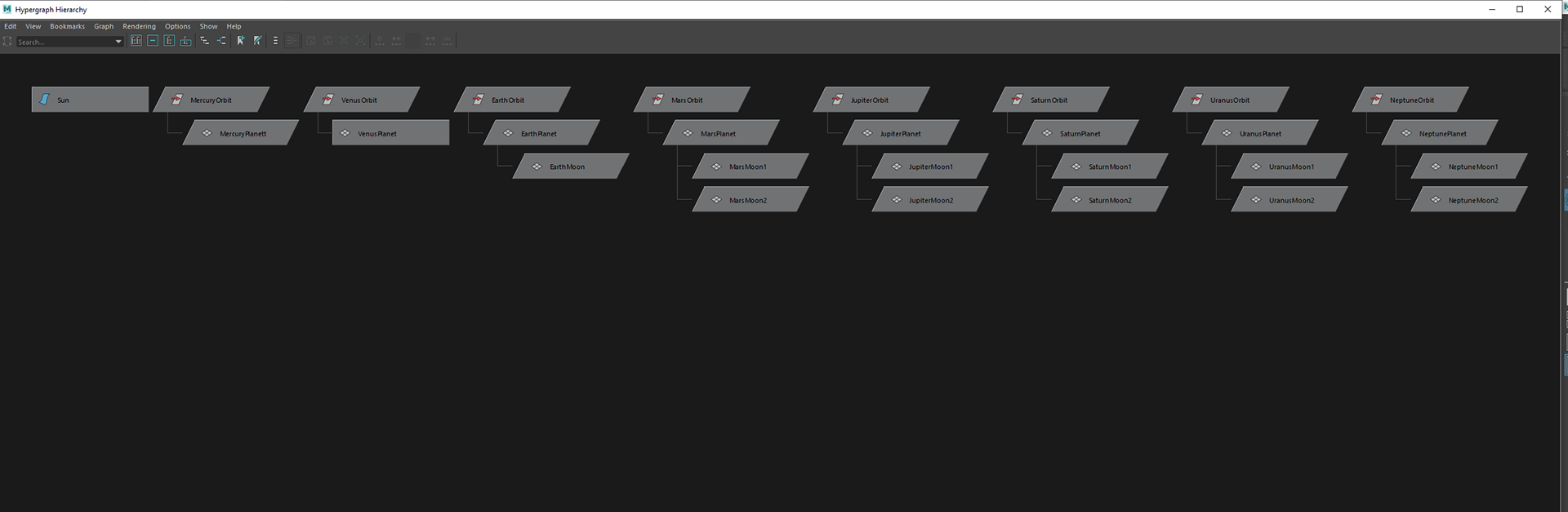 Model and Animate the solar system planets and their moons with reference to the sun. I used polygon primitives to model the sun, planets, and their moons. I also made use of keyframes and the animation editor to make videos by playblasting the animation.