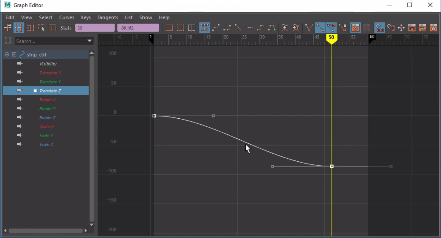 The graph editor provides a sort of visual/graphical depiction of the interpolation between key frames and can be modified. Select the 'Windows' menu and chose 'Graph Editor' under the 'Animation Editor' sub menu to access it. The x axis on the top represents the frame numbers increasing from left to right for a specifically selected channel of an animated component and the y axis represents the values set for the chosen channel of that component. Each key frame is depicted as a square box in space in this graph. Navigating this editor requires the knowledge of these hotkey combinations; Alt+Middle Mouse Button(MMB) lets you pan the graph, Alt+Right Mouse Button (RMB) combined with moving the mouse the around lets you either zoom in or zoom out (dolly in and out), while Alt+Shift+RMB lets you zoom in while either the vertical or the horizontal axis is constrained. A yellow tick running across the graph represents the current frame and moving this lets you scrub across the animation. Moving key frames in the graph Editor requires the use of the MMB after having selected the key frame dragging it to to intended place. In case you want to drag it keeping either the value or the frame number constant (essentially either changing the position of the key frame of the value of a channel in a specific position of a key frame), use the Shift+MMB after having selected the channel and drag either along the horizontal or vertical axis. Inserting keys is rather simple and c an be done by clicking the curve and then selecting the insert key icon on the top left corner of the 'Graph Editor' window. Tangents are the handles associated with each key in the Graph Editor that lets us adjust the angle of approach and departure of a key frame. This in turn allows us sharpen, smoothen or stabilize the animation movement. There are options that let you lock and break tangent handles under 'Tangent' menu which are useful for certain animations.
