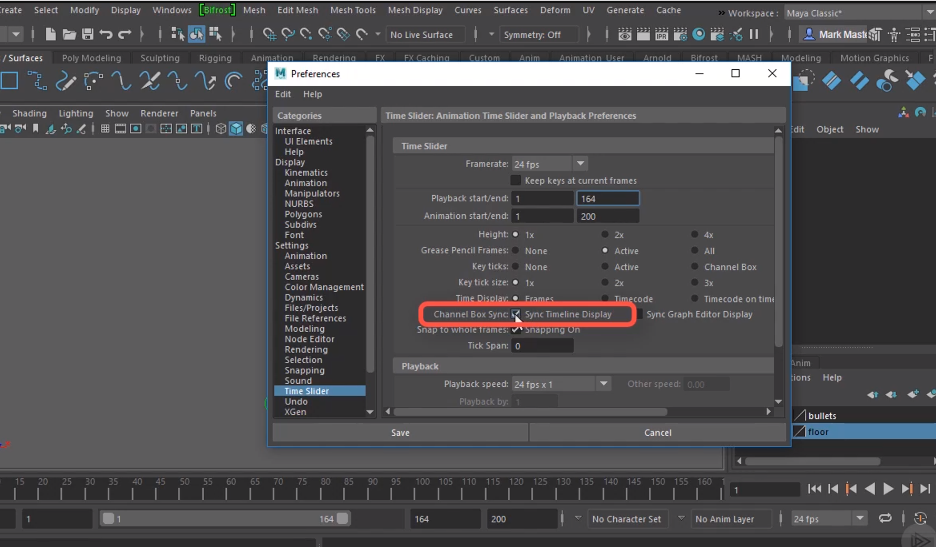 There exists a small icon located in the bottom of the application on the right that lets you directly jump towards animation preferences where a bunch of things can be changed like the size of the time slider window, frame rate, the playback start and end values, the sizes of the key frame ticks and even the channel box sync settings. If we check the 'Sync timeline Display' checkbox then that means that it syncs the timeline to channel box itself. This means that the key frames for whatever channels that are selected in the channel box itself will get displayed (syncing up the channel box to the timeline). Setting the key ticks to smart means that if none of the channels are selected, then the key-frames associated with all the channels will get displayed.