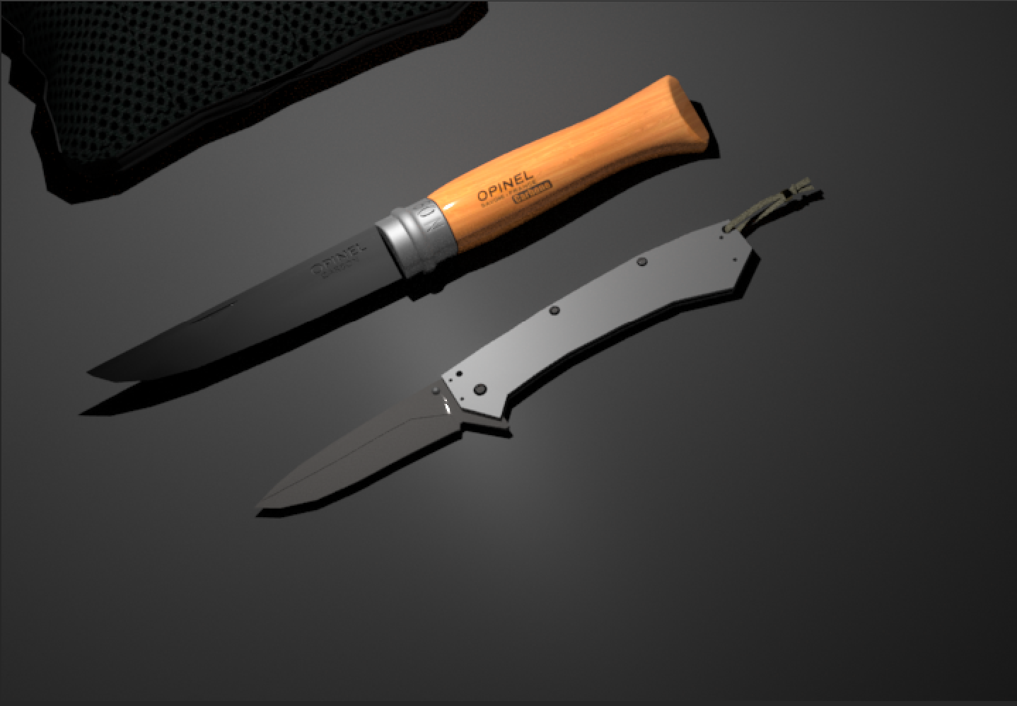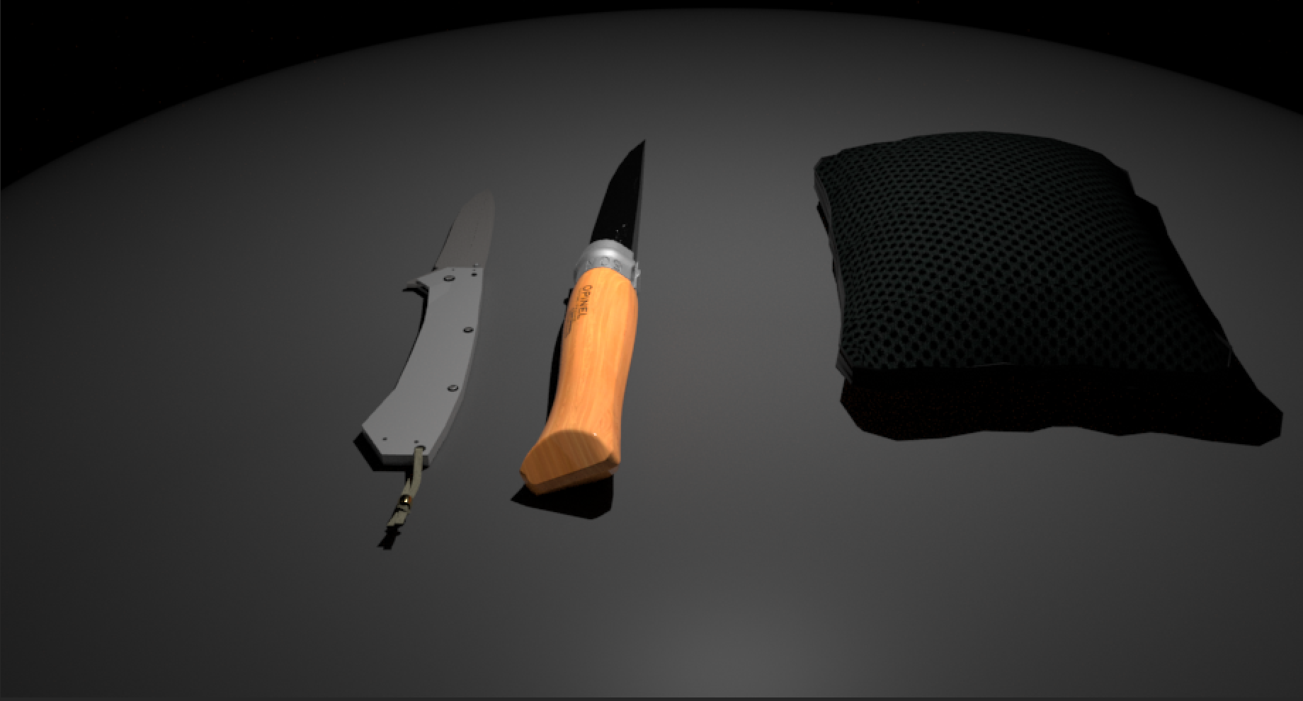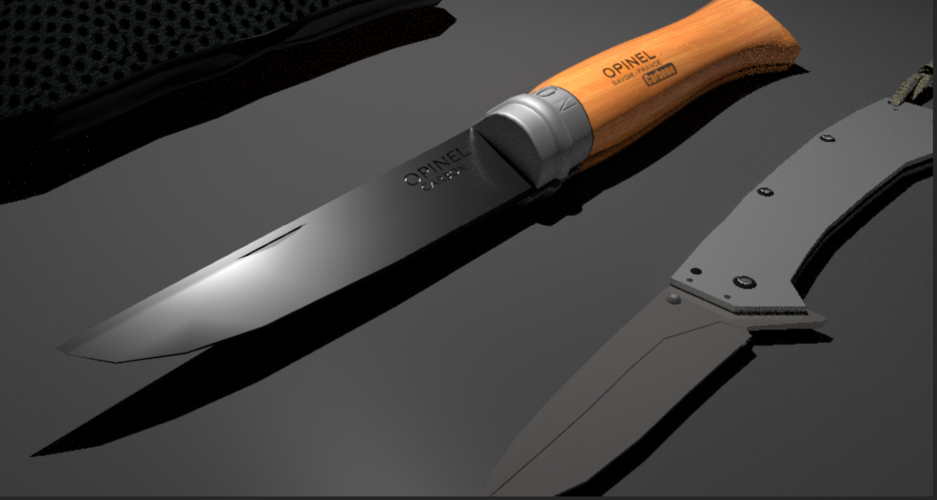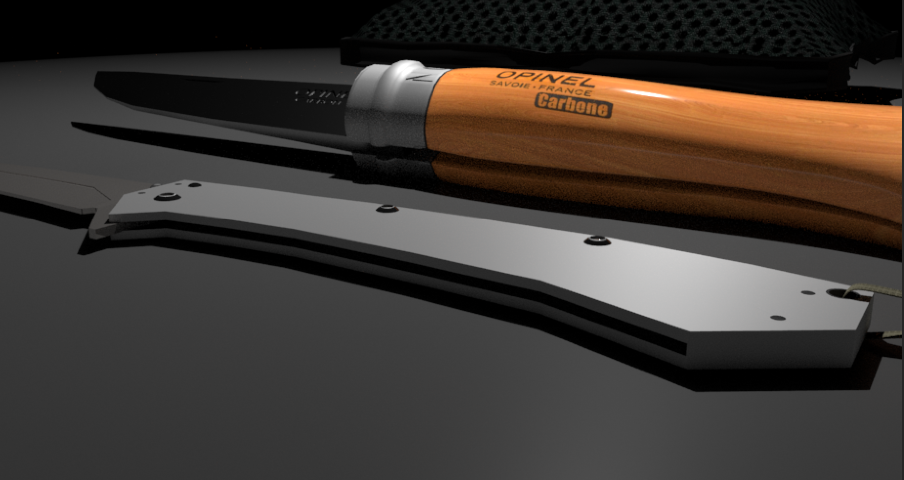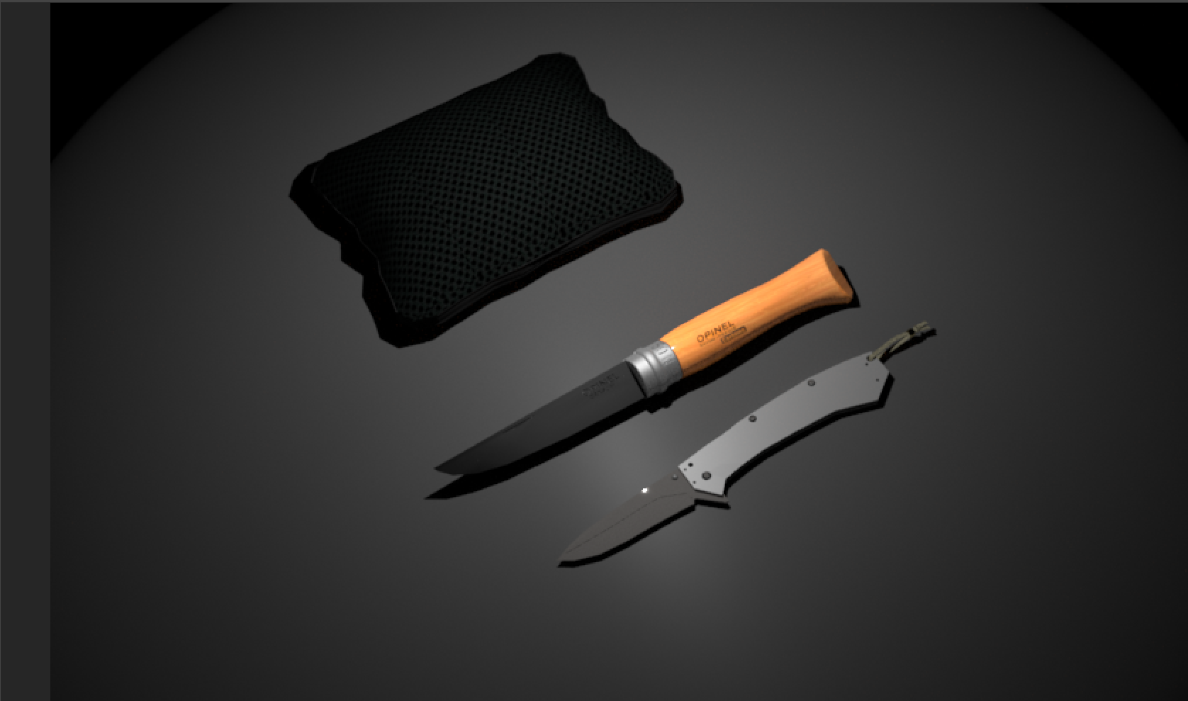 The modeling task required for this project was quite the ask. I was tasked with modeling two knives from the image above along with pouch. The Opinel knife was the most challenging modeling task not because of the complexity of the knife's shape and its structure, but rather due to the fact that the exact shape of the knife is very hard to tell from just an image. The kershaw knife was easier in comparison, but did take a while to model. For the base surface on which the knives sit, I created a plane.