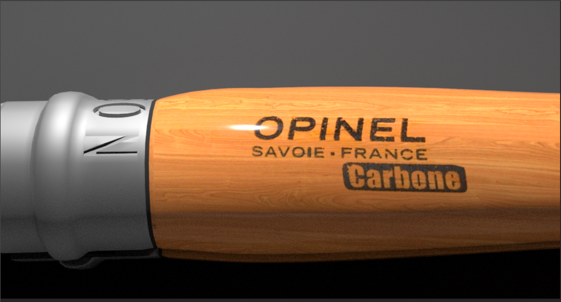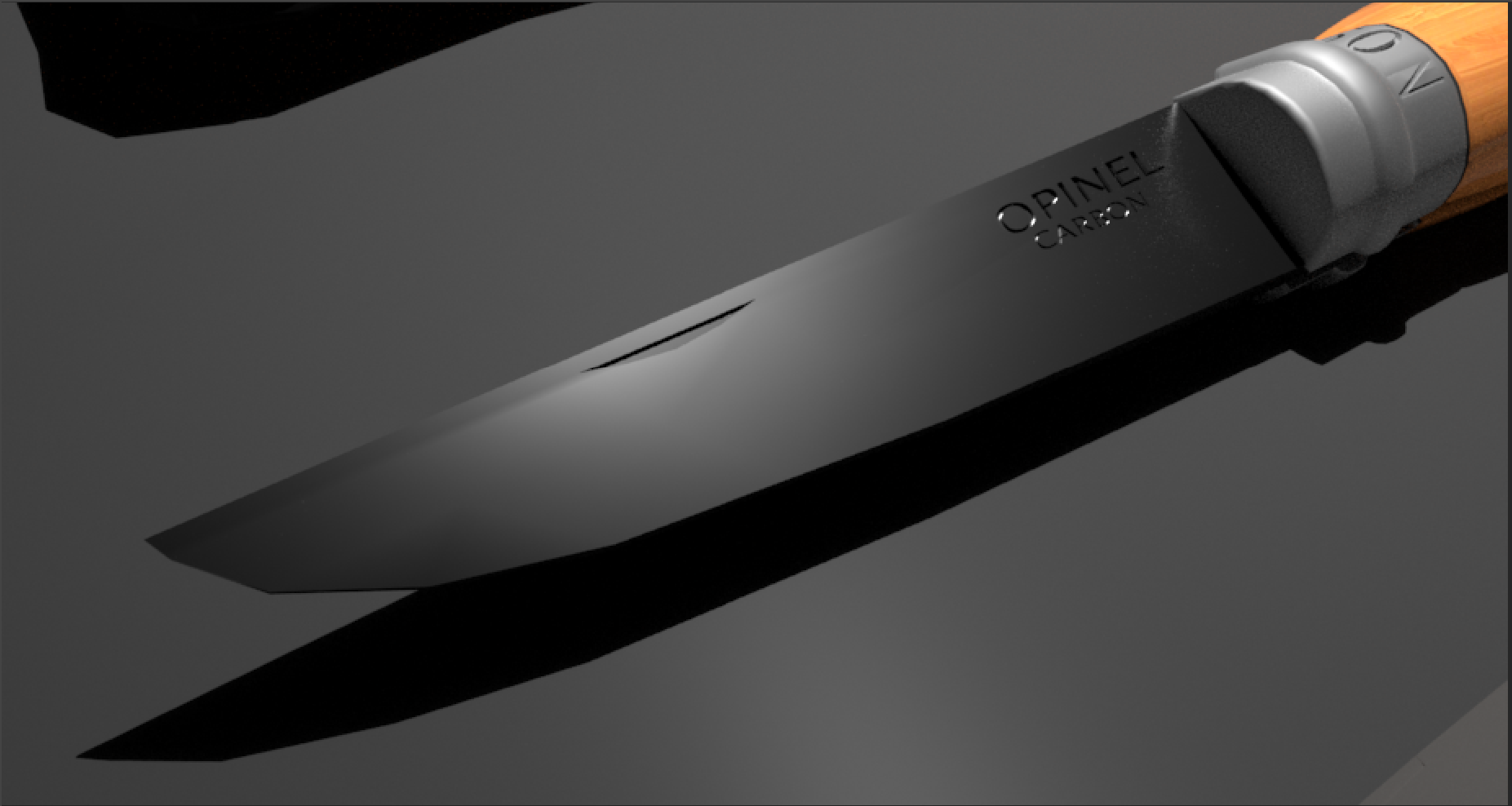 The text part of the knife's blade and rim was pretty straightforward. I created 3D type text with the words 'N 0 6' ( the carved/depressed text that can be seen on the rim ) , 'OPINEL' and 'CARBON' (the carved/depressed text on the blade of the knife). I placed these text types according to reference relative to my knife. To stencil the text into the blade and rim, I simply performed Boolean difference operations as the would created the difference between the selected meshes. Essentially, I used the blade and the rim and performed difference operations with these texts respectively. This created the engravings on the knife.