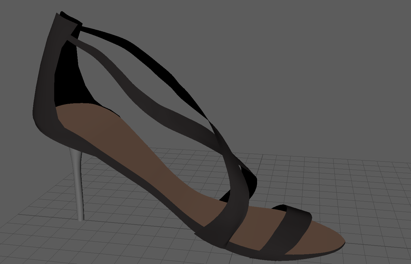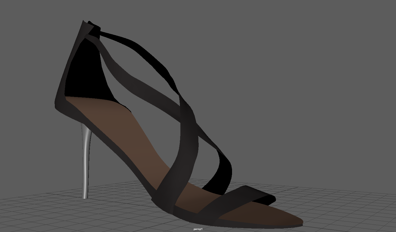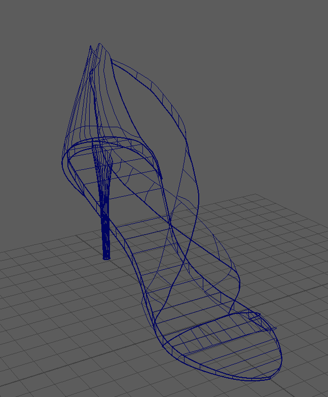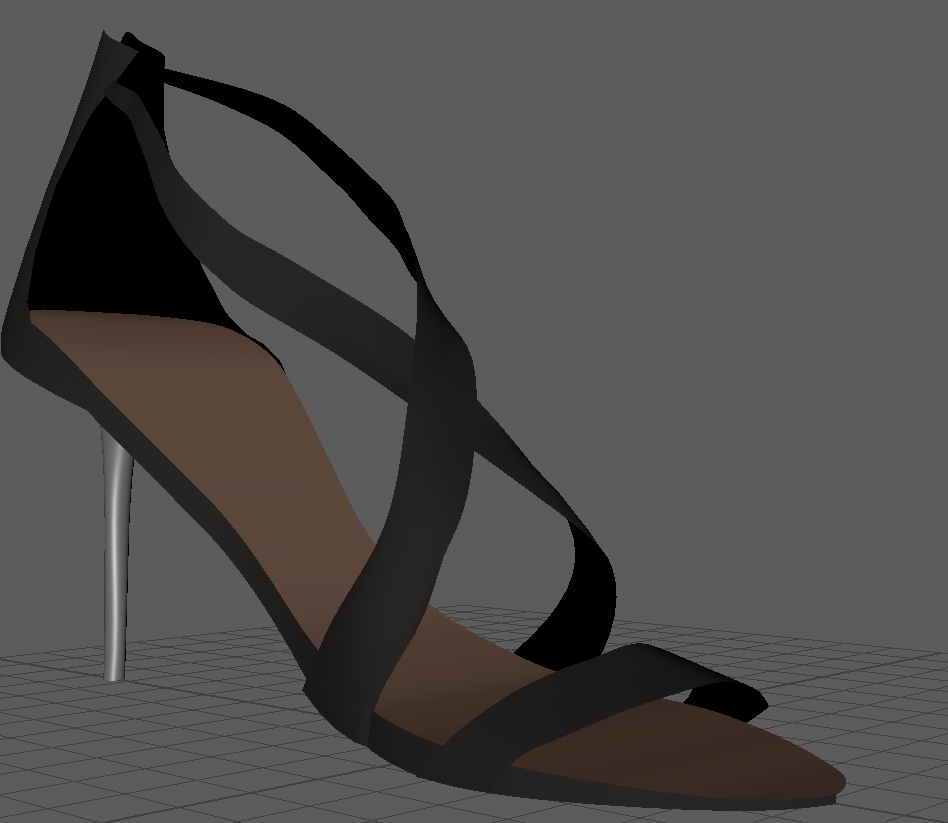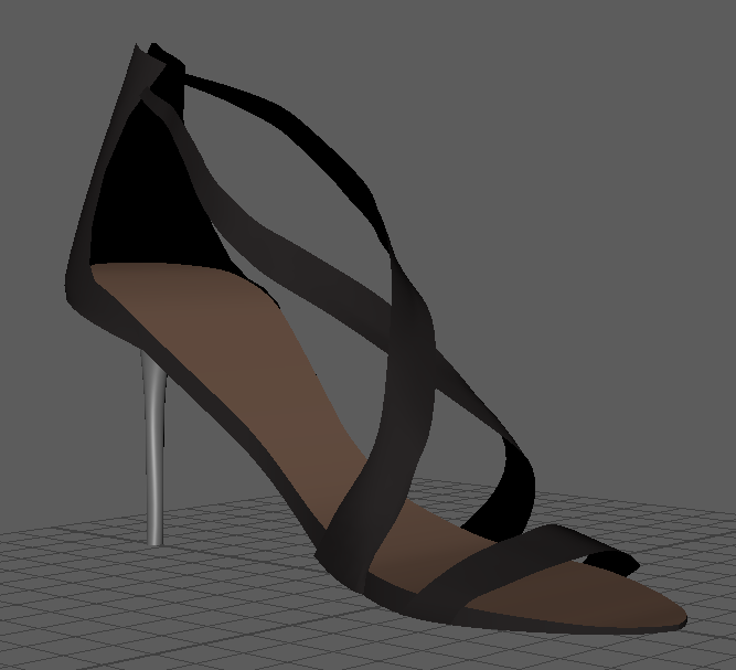 Model a High heel shoe based on the reference image provided using NURBS only. The reference image is shown below To model the shoe I took the following steps: -First I created a Curve using an EP curve tool - I closed the curve and beveled the edges to create a smooth like beveled appearance with some slight thickness. - After this I lofted this curve on another curve which created a planar surface for the sole - I then created the back covering surface for the 'Achilles heel tendon' using multiple curves shaped as arcs places in a somewhat concentric fashion from bottom to top. -These curves differed in sizes. The one in the bottom was the largest followed by smaller ones. This was done until reach the top of the back tendon covering surface was reached. i used five curves for this. -Next I modeled the front strap using curves, lofting and beveling. I rotated the surfaces and moved around the vertices to make it look like the front strap of the shoe that covers the toe bones. -In a similar fashion, I made use of curves, lofting and beveling to create the two feet straps following which i Moved around vertices to adjust for one strap being on top of the other. This was the most time consuming part of the assignment. -Then I used NURBS circles and curves in a concentric fashion to create the heel. the concentric circles were from bottom to top and the last few were larger in size to account for the larger base that is attached to the shoe sole (outside part). -I made use of symmetry for the straps and the curves. -Finally, using the hypershade editor, I created lambert colors and applied them to lofted, planar and beveled surfaces to give the shoe its color.
