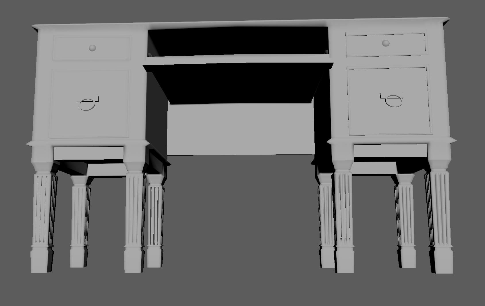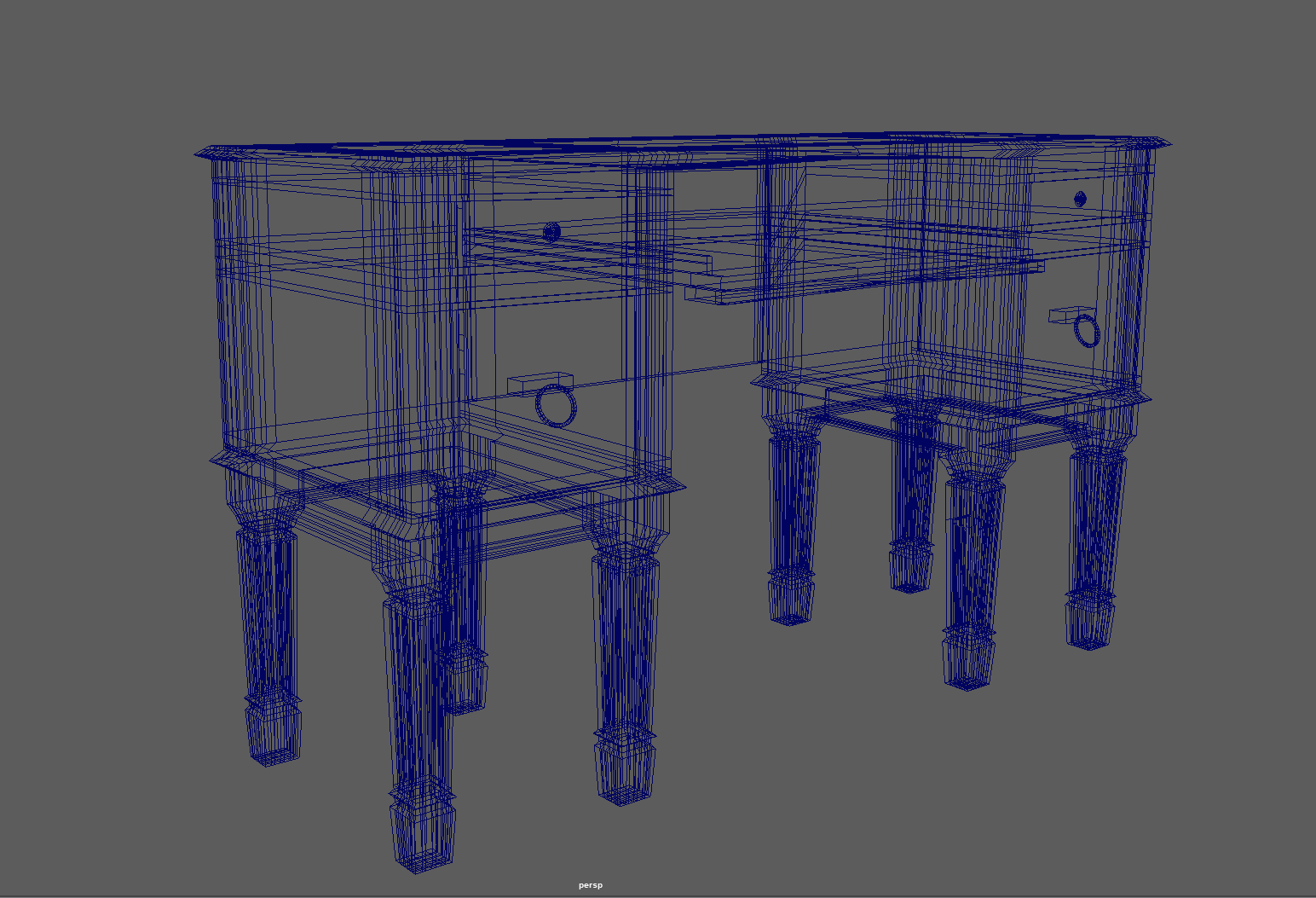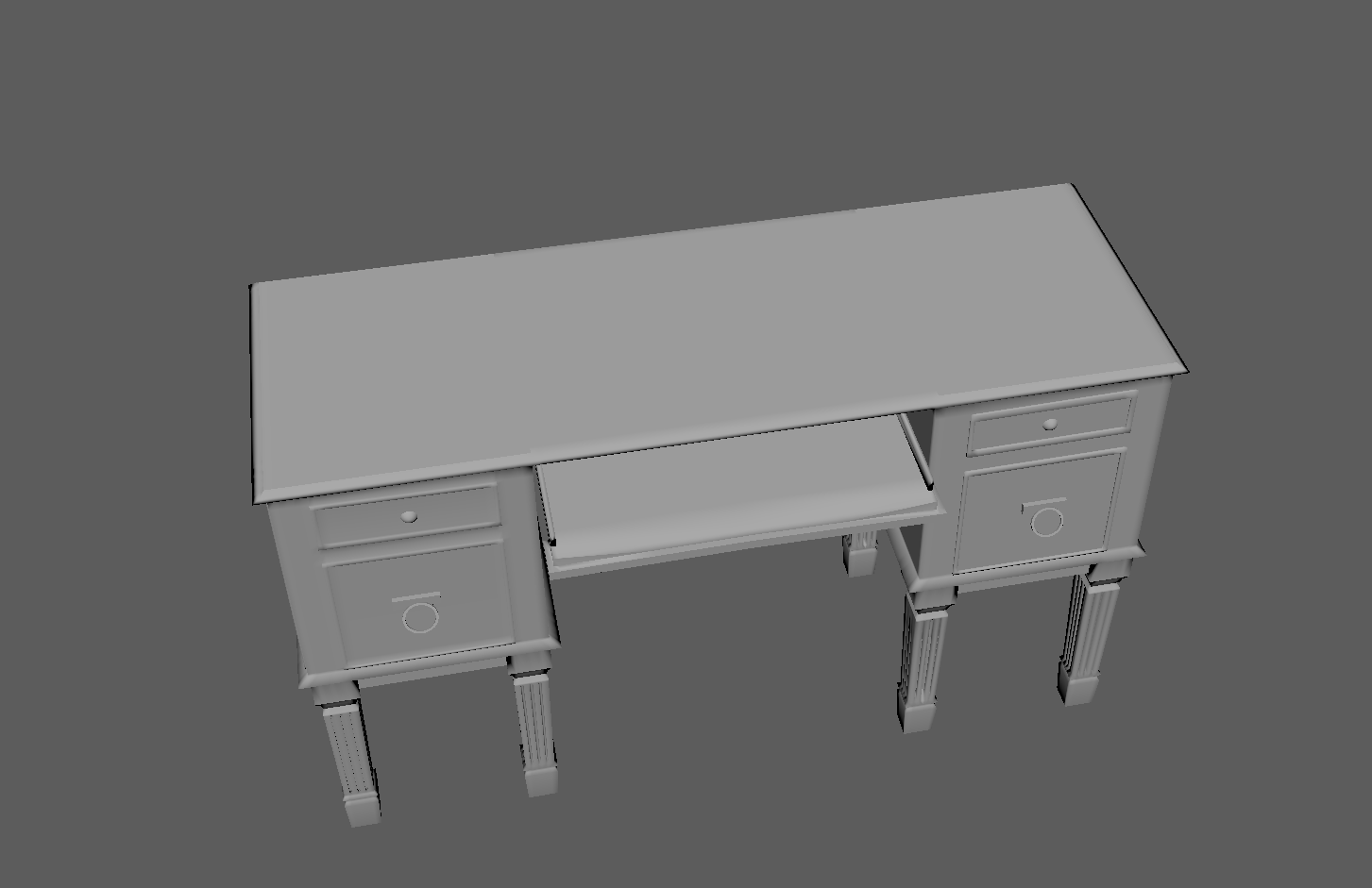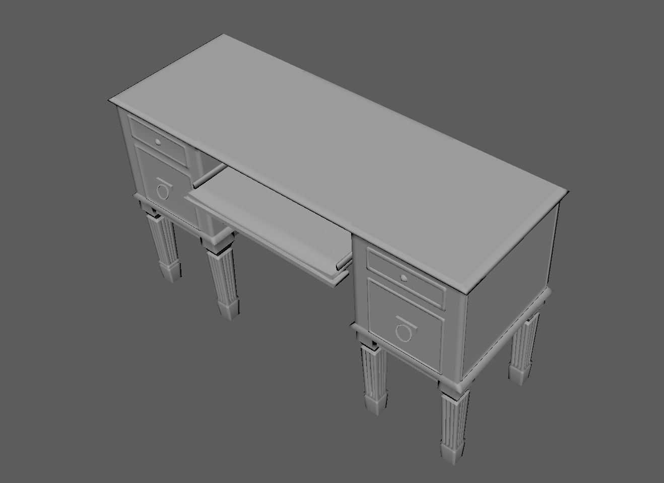 Model a desk based on the Reference Image provided. I took the following steps to model the desk: -I conceptualized the design task as a mirroring or duplicating task, where the left side of the desk is a laterally inverted form of the right side. -With this conceptual idea in mind, I worked towards modeling one half completely and further mirroring the completed half when done. - I first created a cube polygon primitive (appropriately scaled with sufficient subdivisions) for the top table like surface. -I constantly extruded and scaled faces to match the shape of the desk in the reference image. More specifically, I started from the table top surface and went down towards the drawer and legs in that order. -I Inserted edge loops wherever I had to create edges which allowed me to build on geometry by further extrusion and scaling. -I scaled alternate faces on the legs to create a ridge like appearance. -I also used the add divisions tool to subdivide the base of the drawer face. - I added faces using the ad divisions and further used the multi cut tool to create the ridges in all the legs of the desk. -Once I was done with the left side of desk, I mirrored this one object and combined the duplicate object as a result to form one complete desk.